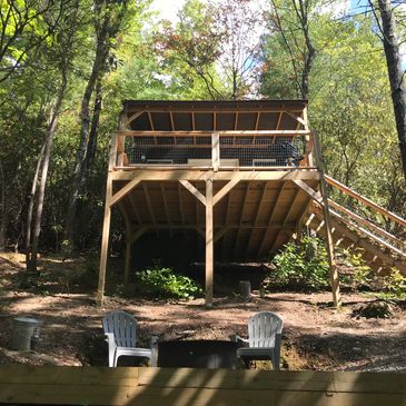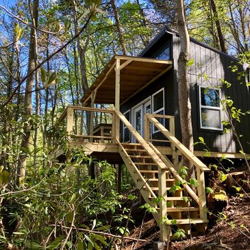 Treehouse #1 sits quietly on a northeastern facing ridge enjoying northern views of Snowbird Mountain and the eastern sunrise over Cherokee National Forest land towards Mt Sterling. The specific site for the treehouse was chosen based on naturally occurring tree cover and minimal construction impact to surrounding vegetation. It's as if the treehouse was placed on the mountainside completely assembled. A private fire ring and chairs are steps away.